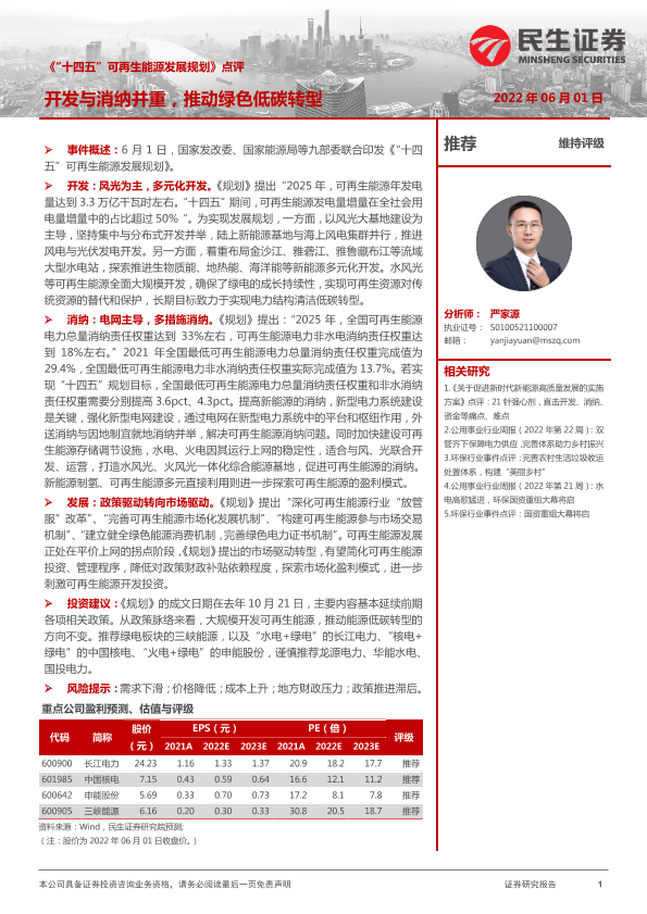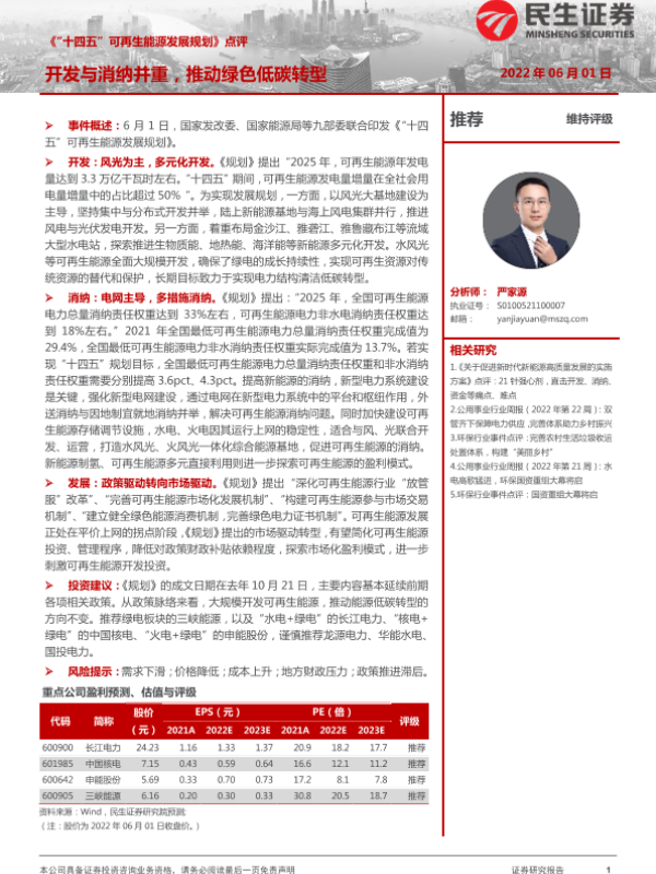 【民生证券】【20220601】“十四五”可再生能源发展规划点评-开发与消纳并重,推动绿色低碳转型-2页