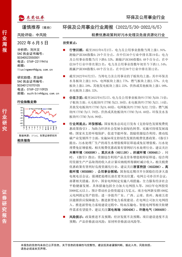 【东莞证券】【20220605】环保及公用事业行业周报:税费优惠政策利好污水处理及危废资源化行业-11页