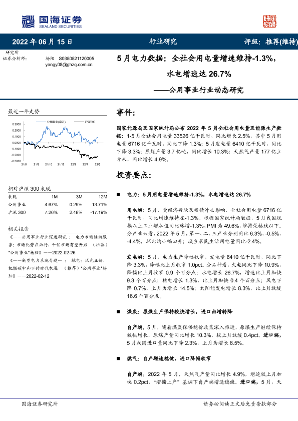 【国海证券】【20220615】5月电力数据:全社会用电量增速维持-1.3%,水电增速达26.7%-11页