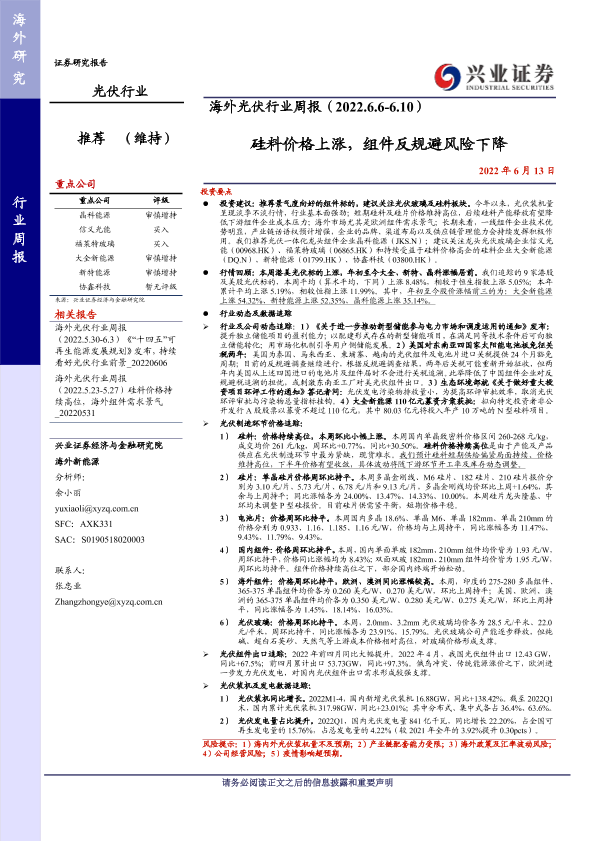 【兴业证券】【20220613】海外光伏行业周报:硅料价格上涨,组件反规避风险下降-16页