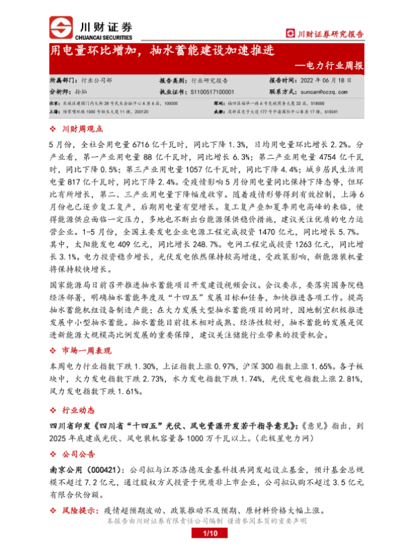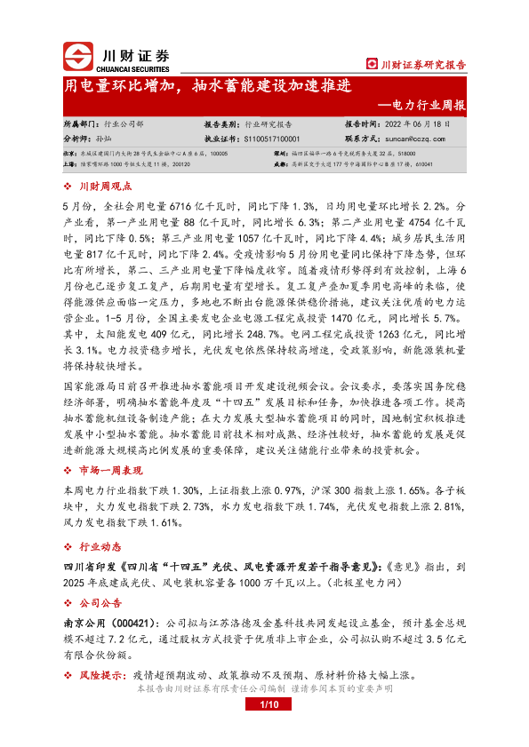 【川财证券】【20220618】用电量环比增加,抽水蓄能建设加速推进-10页