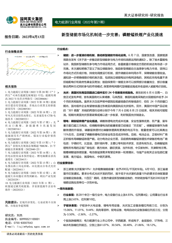 【英大证券】【20220613】电力能源行业周报:新型储能市场化机制进一步完善;磷酸锰铁锂产业化提速-29页