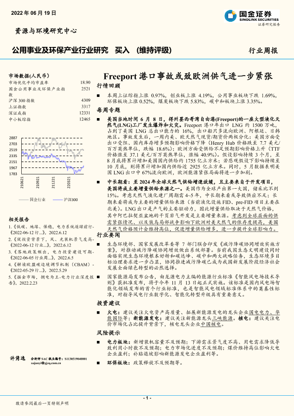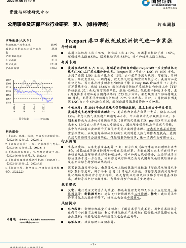 【国金证券】【20220619】公用事业及环保产业行业研究:Freeport港口事故或致欧洲供气进一步紧张-14页