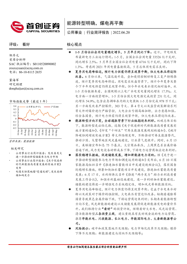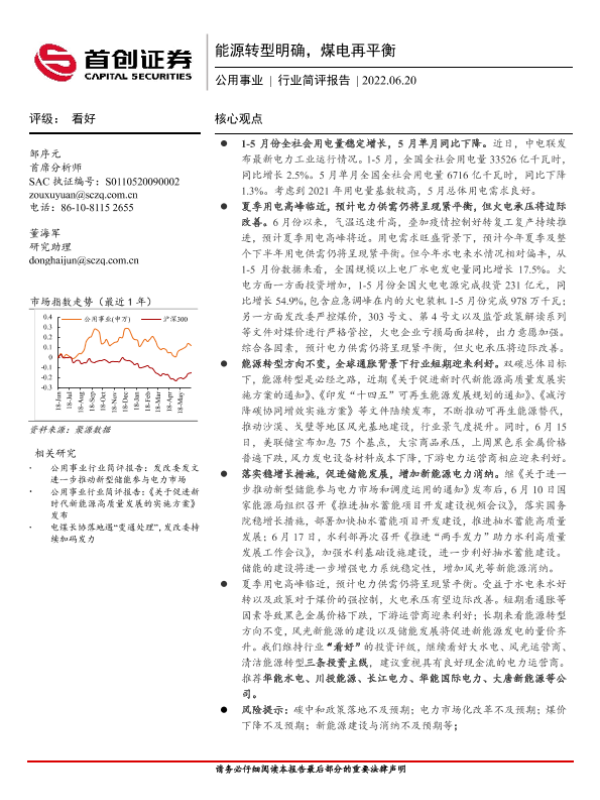 【首创证券】【20220620】公用事业行业简评报告:能源转型明确,煤电再平衡-12页