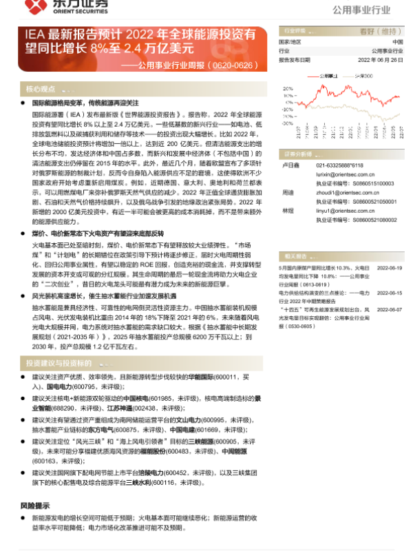 【东方证券】【20220626】公用事业行业周报:IEA最新报告预计2022年全球能源投资有望同比增长8%至2.4万亿美元-14页