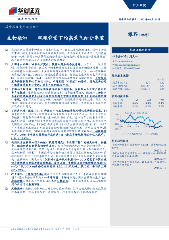 【华创证券】【20220624】碳中和改变中国系列五:生物柴油——双碳背景下的高景气细分赛道-45页