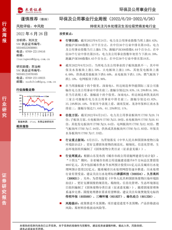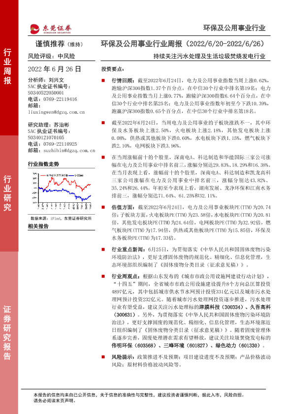 【东莞证券】【20220626】环保及公用事业行业周报:持续关注污水处理及生活垃圾焚烧发电行业-11页