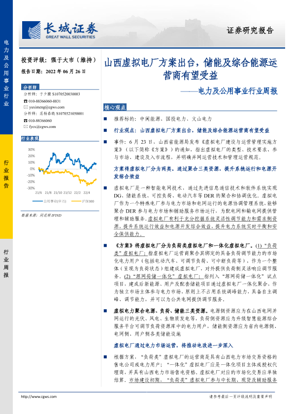 【长城证券】【20220626】电力及公用事业行业周报:山西虚拟电厂方案出台,储能及综合能源运营商有望受益-13页