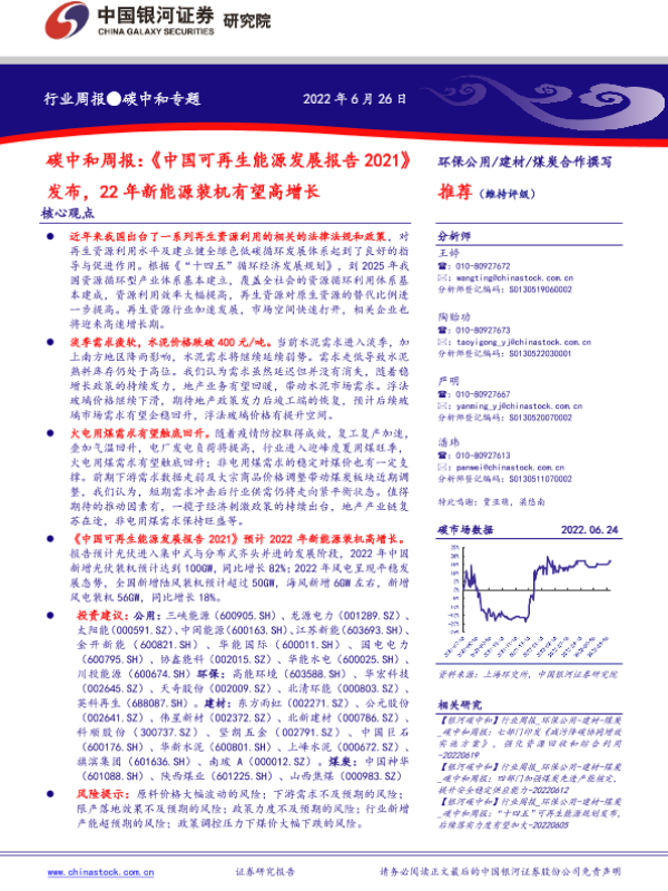 【银河证券】【20220626】碳中和周报:《中国可再生能源发展报告2021》发布,22年新能源装机有望高增长-21页