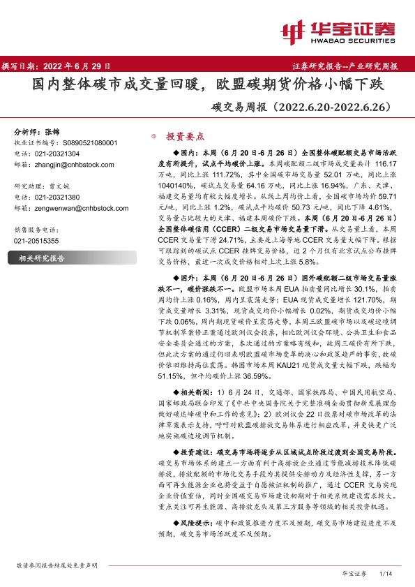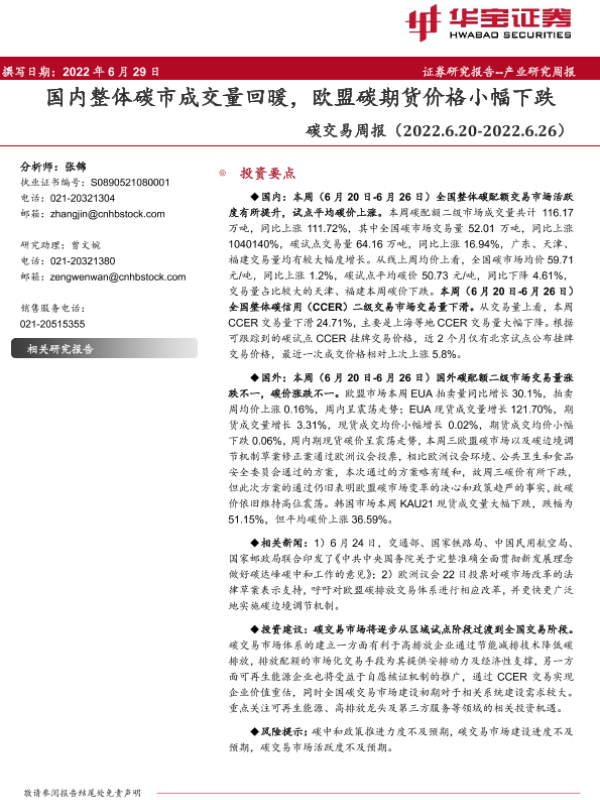 【华宝证券】【20220629】国内整体碳市成交量回暖,欧盟碳期货价格小幅下跌-14页