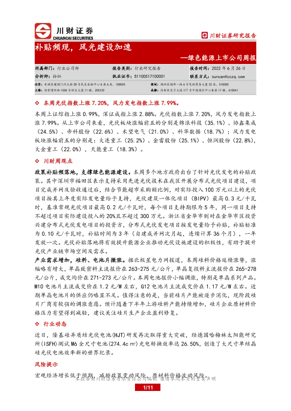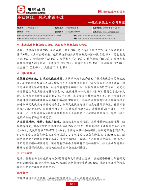 【川财证券】【20220626】绿色能源上市公司周报:补贴频现,风光建设加速-11页