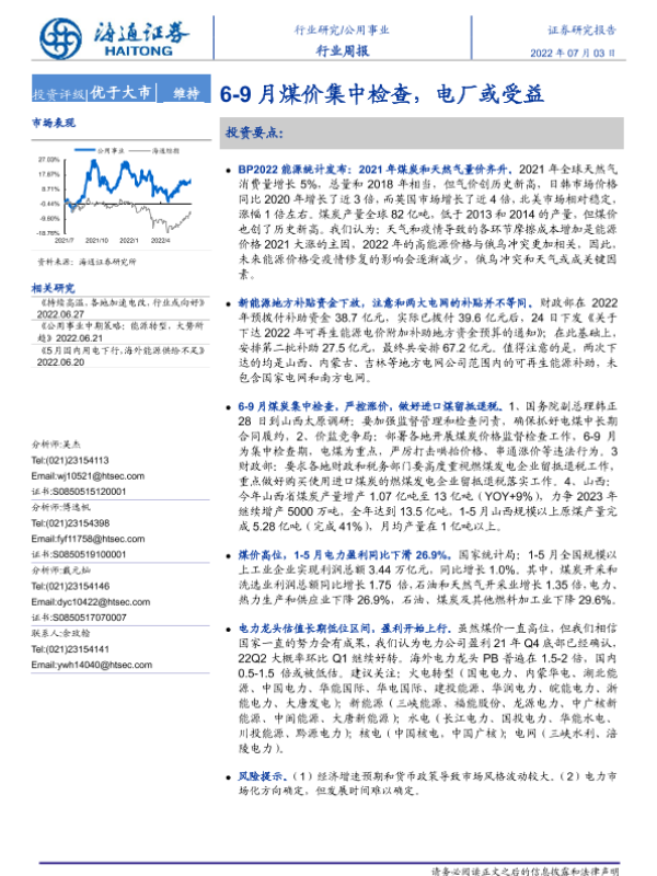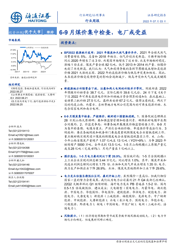 【海通证券】【20220703】公用事业行业周报:6-9月煤价集中检查,电厂或受益-2页