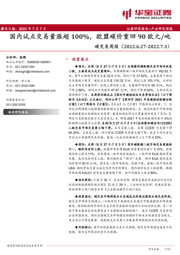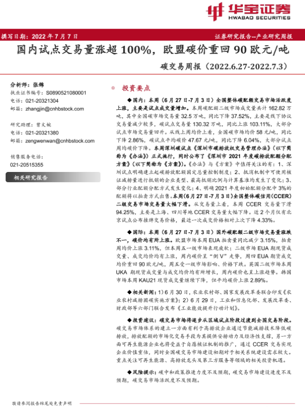 【华宝证券】【20220707】碳交易周报:国内试点交易量涨超100%,欧盟碳价重回90欧元/吨-13页