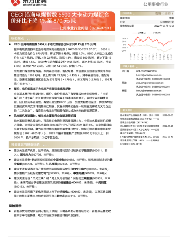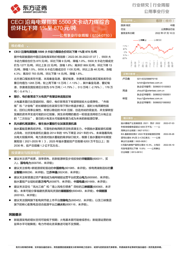 【东方证券】【20220710】公用事业行业周报:CECI沿海电煤指数5500大卡动力煤综合价环比下降1%至870元/吨-15页