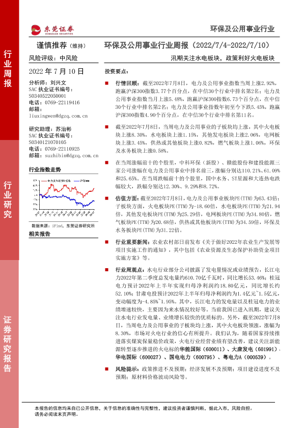 【东莞证券】【20220710】环保及公用事业行业周报:汛期关注水电板块,政策利好火电板块-12页