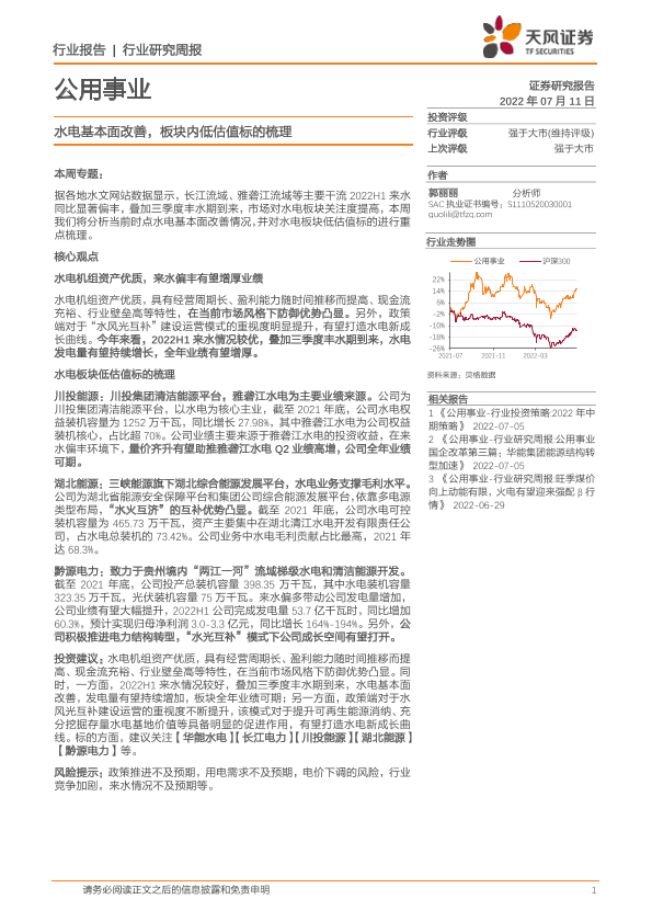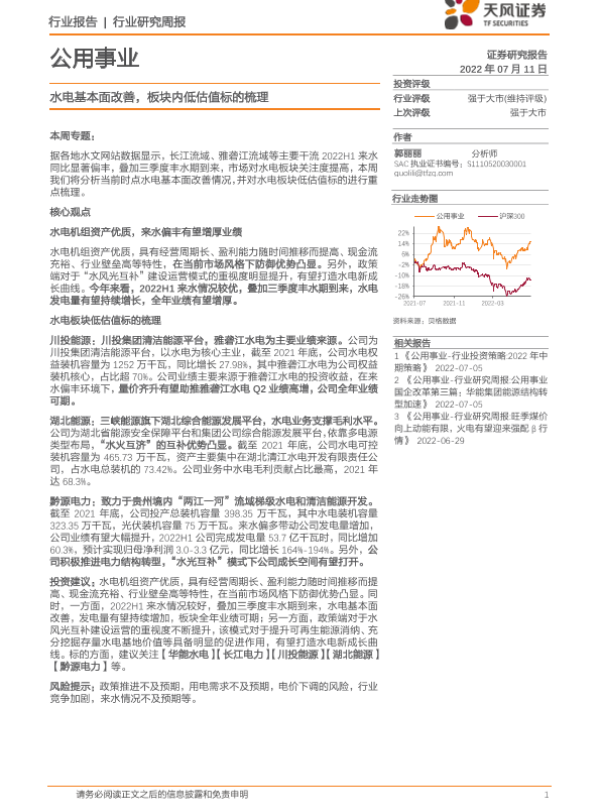 【天风证券】【20220711】公用事业行业研究周报:水电基本面改善,板块内低估值标的梳理-17页