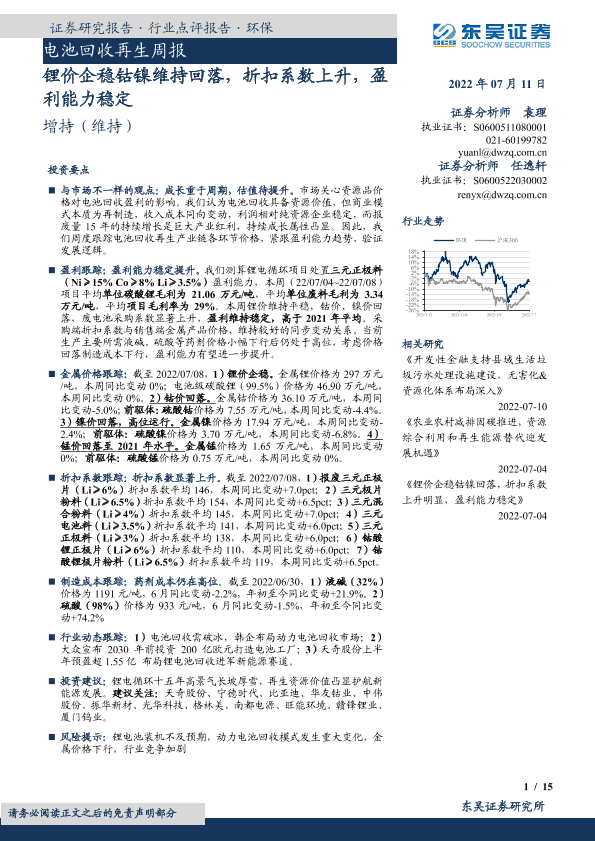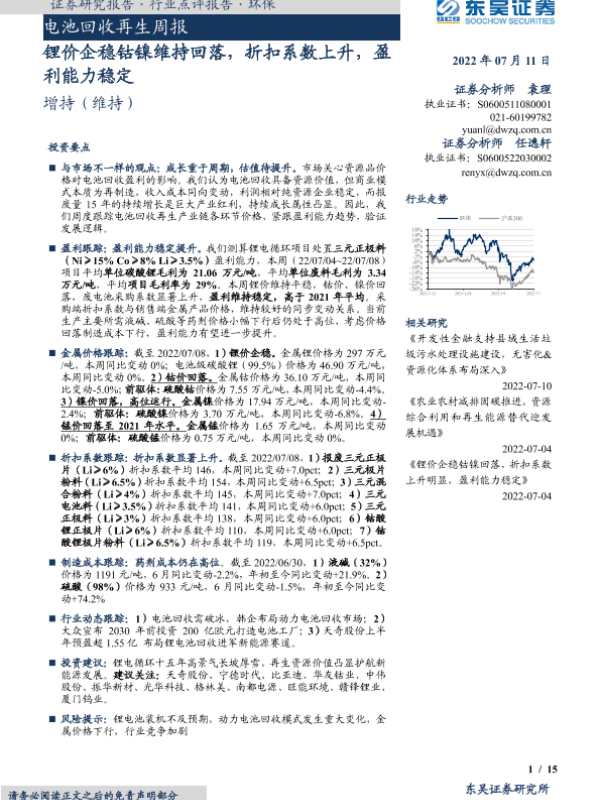 【东吴证券】【20220711】电池回收再生周报:锂价企稳钴镍维持回落,折扣系数上升,盈利能力稳定-15页