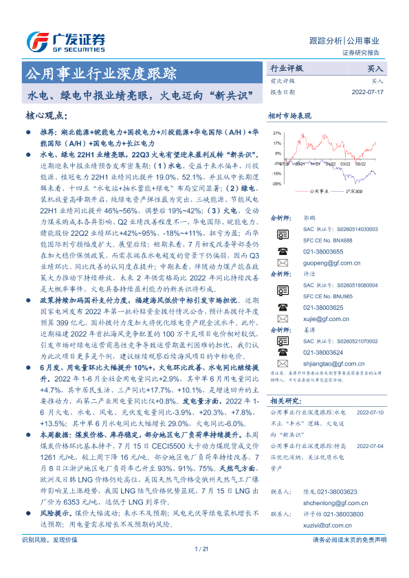 【广发证券】【20220717】公用事业行业深度跟踪:水电、绿电中报业绩亮眼,火电迈向“新共识”-21页