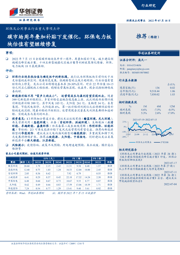 估值修复 政策催化 新能源补贴 环保电力 碳市场