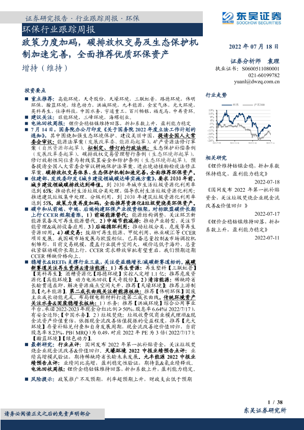 【东吴证券】【20220718】环保行业跟踪周报:政策力度加码,碳排放权交易及生态保护机制加速完善-38页