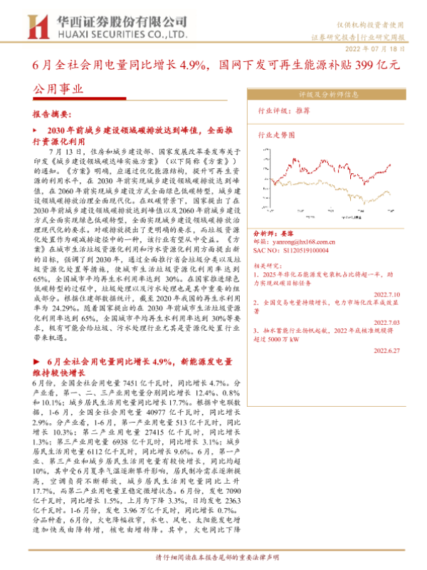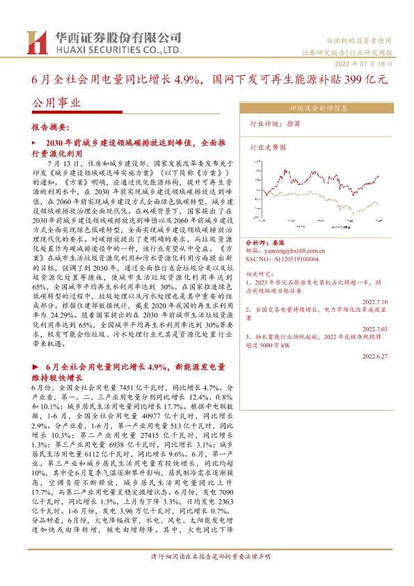 【华西证券】【20220718】6月全社会用电量同比增长4.9%,国网下发可再生能源补贴399亿元-27页