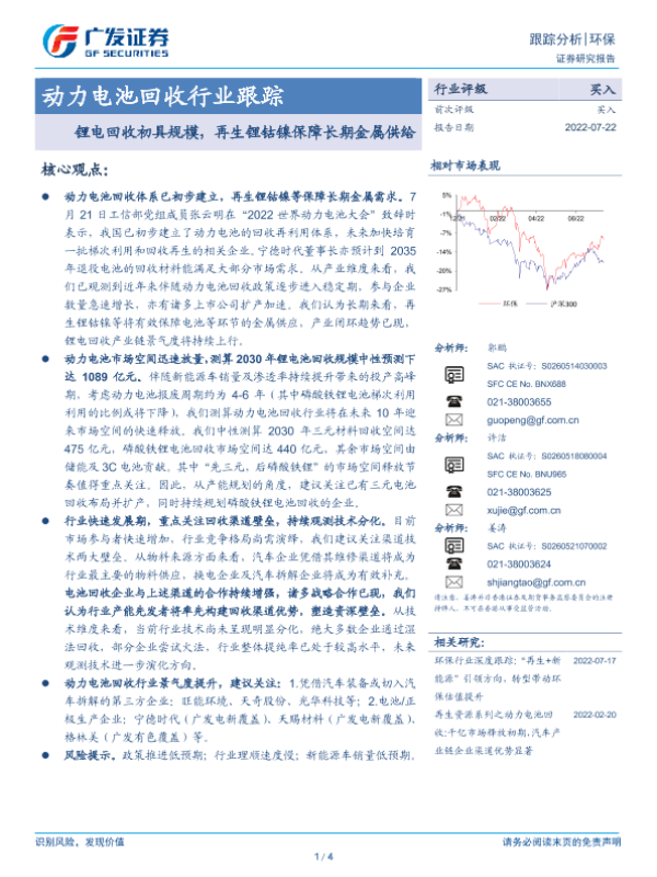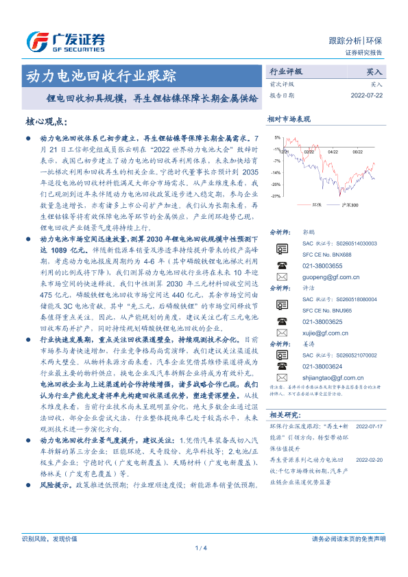 【广发证券】【20220722】动力电池回收行业跟踪:锂电回收初具规模,再生锂钴镍保障长期金属供给-4页