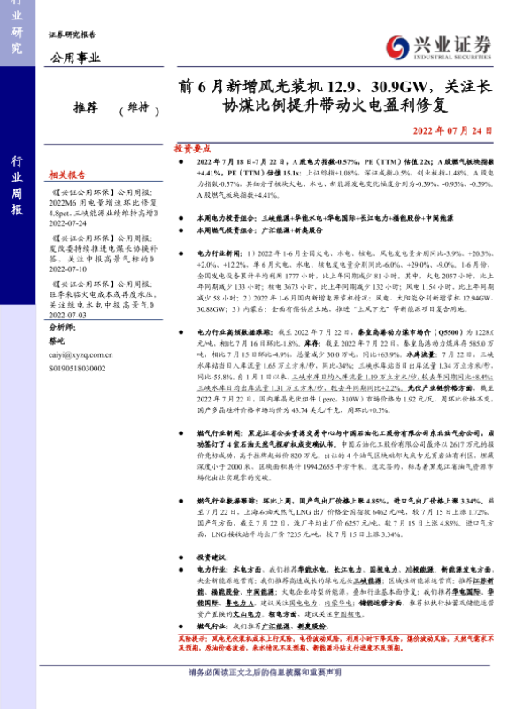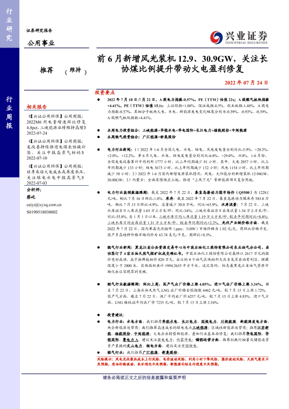 【兴业证券】【20220724】前6月新增风光装机12.9、30.9GW,关注长协煤比例提升带动火电盈利修复-24页