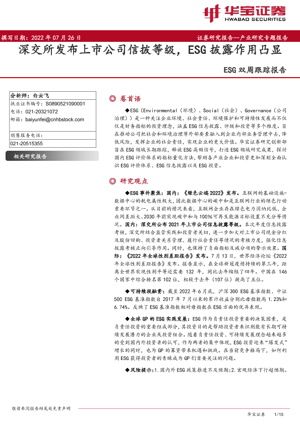 【华宝证券】【20220726】环保行业ESG双周跟踪报告:深交所发布上市公司信披等级,ESG披露作用凸显-15页