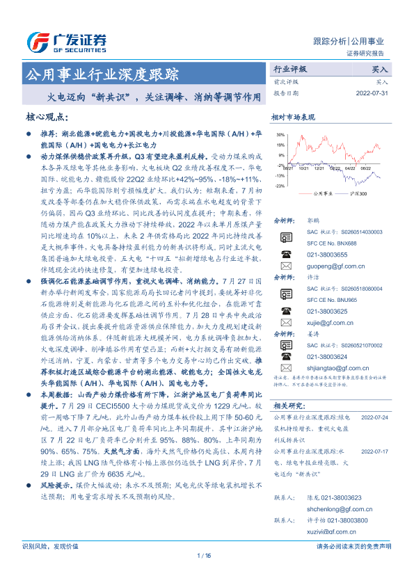 【广发证券】【20220731】公用事业行业深度跟踪:火电迈向“新共识”,关注调峰、消纳等调节作用-16页
