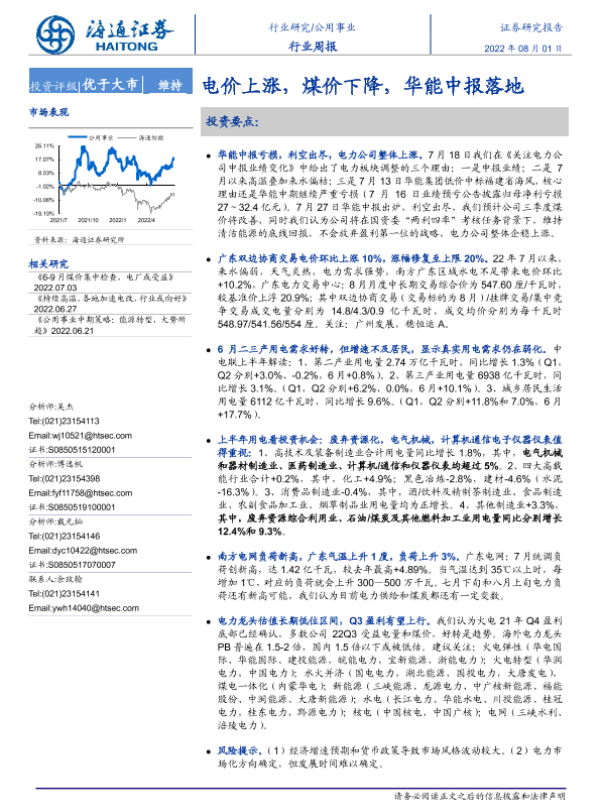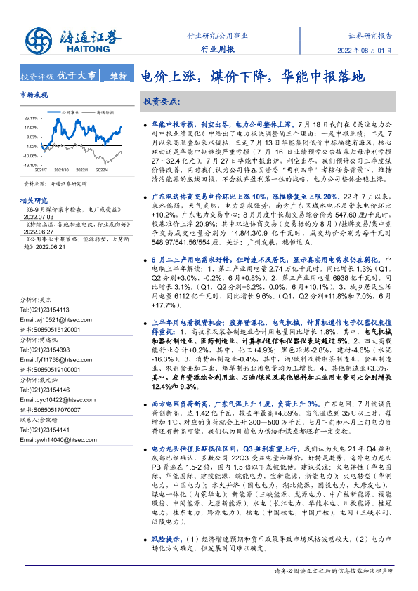 【海通证券】【20220801】公用事业行业周报:电价上涨,煤价下降,华能中报落地-3页