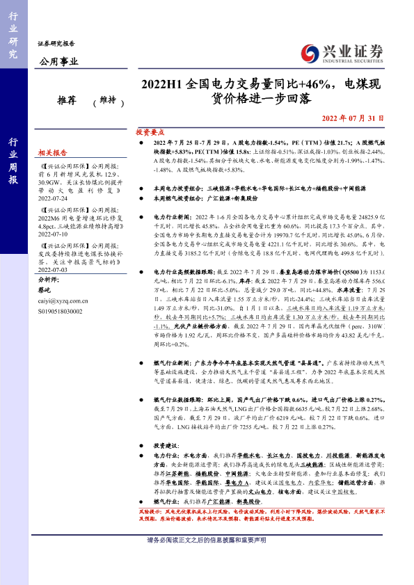 【兴业证券】【20220731】2022H1全国电力交易量同比+46%,电煤现货价格进一步回落-22页