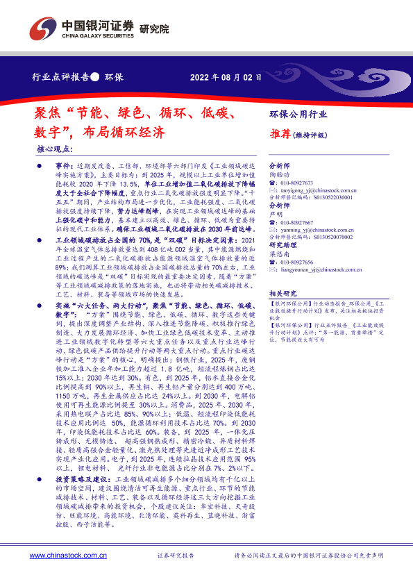 工业领域 循环经济 环保公用 碳达峰 节能减碳