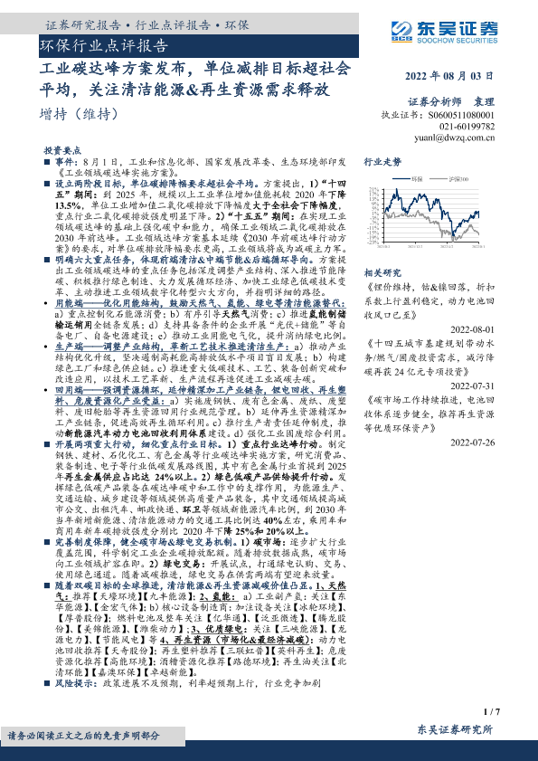 【东吴证券】【20220803】环保行业点评报告:工业碳达峰方案发布,单位减排目标超社会平均,关注清洁能源&再生资源需求释放-7页