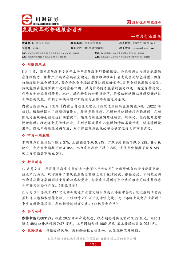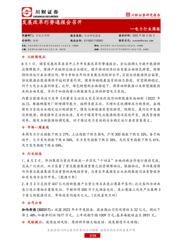 【川财证券】【20220806】电力行业周报:发展改革形势通报会召开-10页