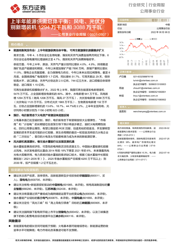 【东方证券】【20220808】公用事业行业周报:上半年能源供需总体平衡;风电、光伏分别新增装机1294万千瓦和3088万千瓦-15页