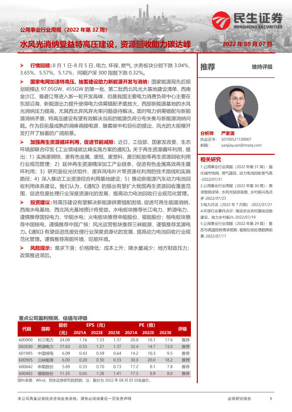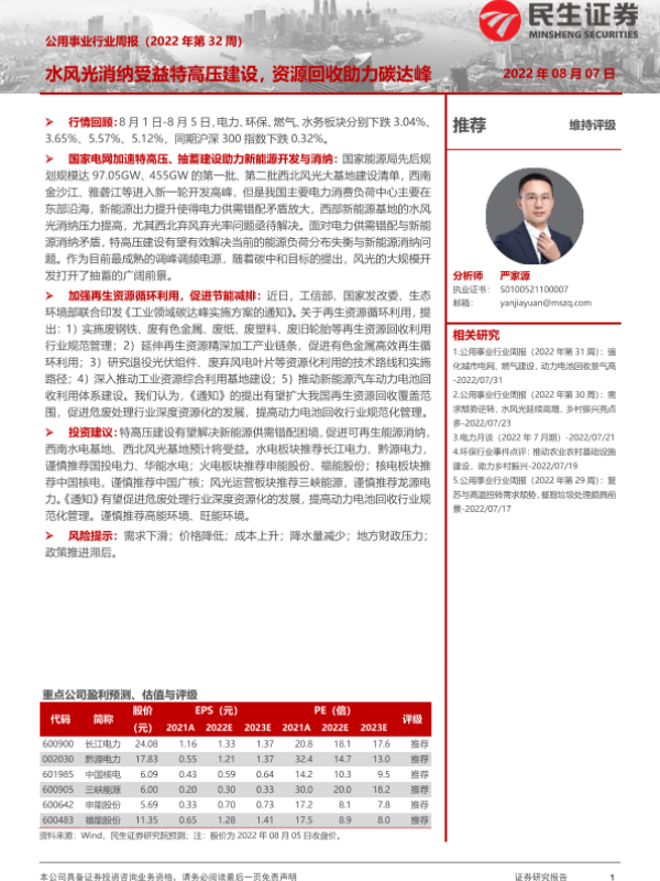 【民生证券】【20220807】公用事业行业周报:水风光消纳受益特高压建设,资源回收助力碳达峰-28页