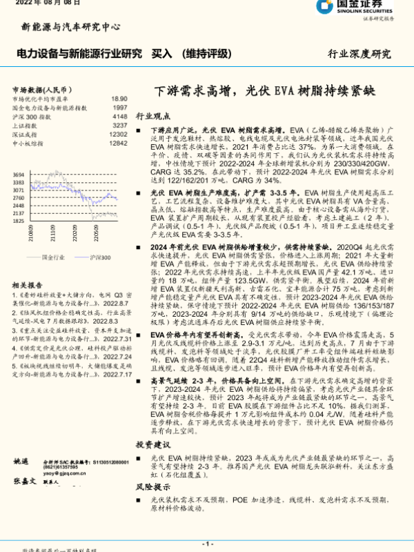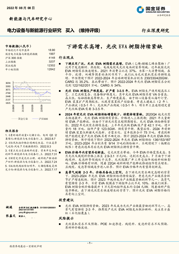 【国金证券】【20220808】电力设备与新能源行业研究:下游需求高增,光伏EVA树脂持续紧缺-15页