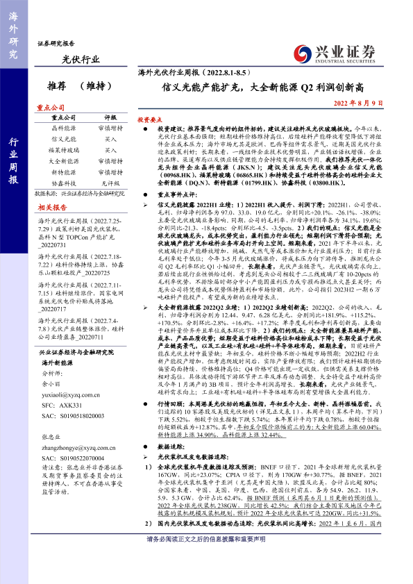 【兴业证券】【20220809】海外光伏行业周报:信义光能产能扩充,大全新能源Q2利润创新高-22页