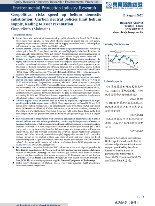 【东吴证券(香港)】【20220812】氦气:气体黄金进口依赖97.5%,国产替代加速,碳中和约束供应资源端重估-15页