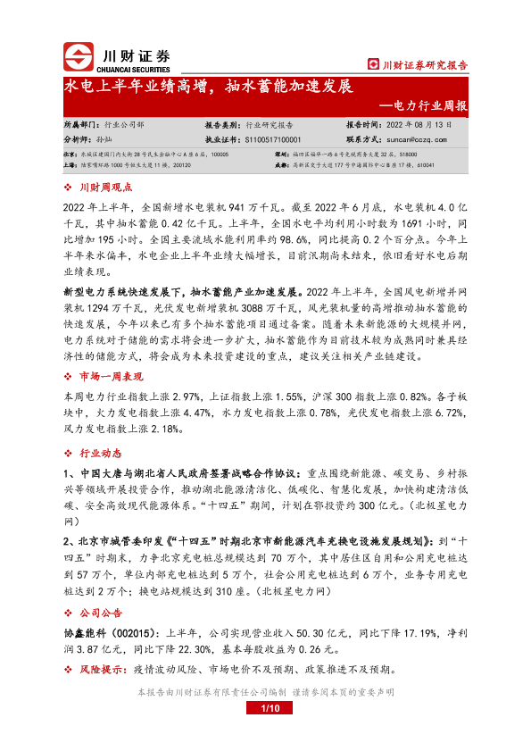 【川财证券】【20220813】电力行业周报:水电上半年业绩高增,抽水蓄能加速发展-10页