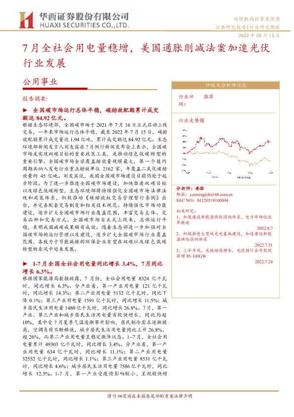 【华西证券】【20220813】7月全社会用电量稳增,美国通胀削减法案加速光伏行业发展-22页
