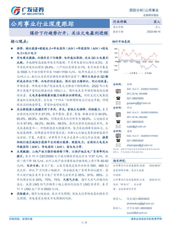 【广发证券】【20220814】公用事业行业深度跟踪:煤价下行趋势打开,关注火电盈利进程-17页
