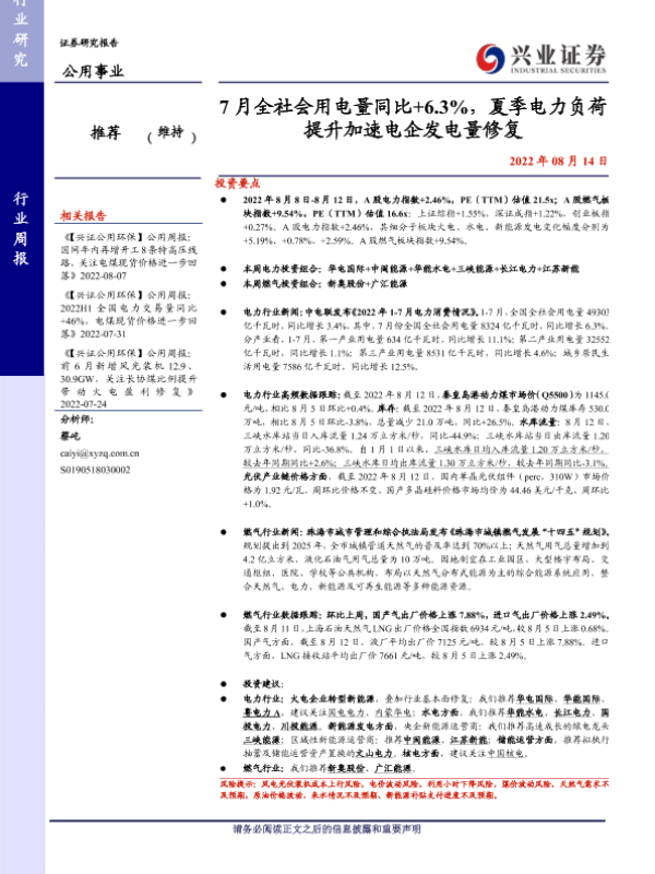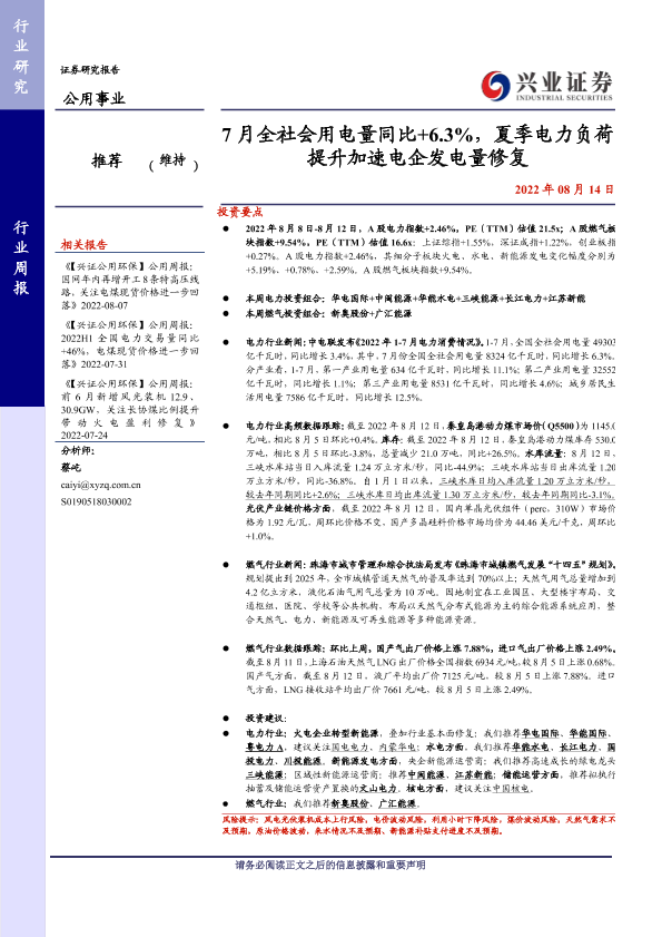 【兴业证券】【20220814】7月全社会用电量同比+6.3%,夏季电力负荷提升加速电企发电量修复-23页
