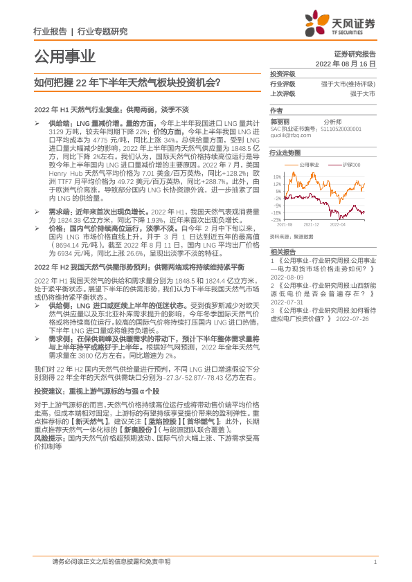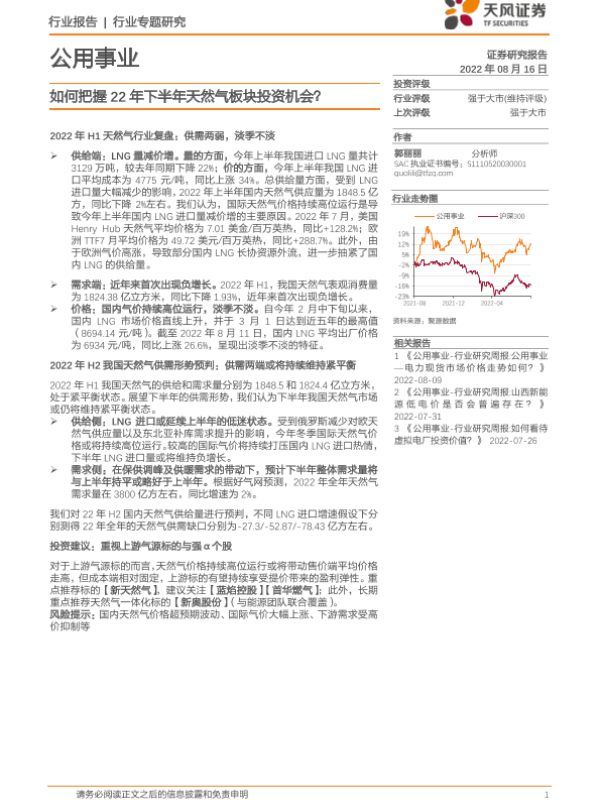 【天风证券】【20220816】公用事业行业专题研究:如何把握22年下半年天然气板块投资机会?-9页
