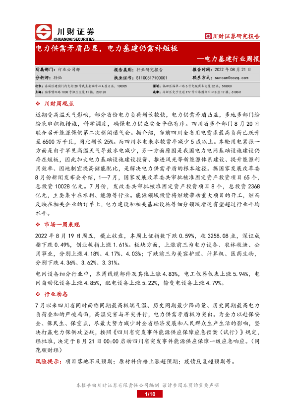 【川财证券】【20220821】电力基建行业周报:电力供需矛盾凸显,电力基建仍需补短板-10页