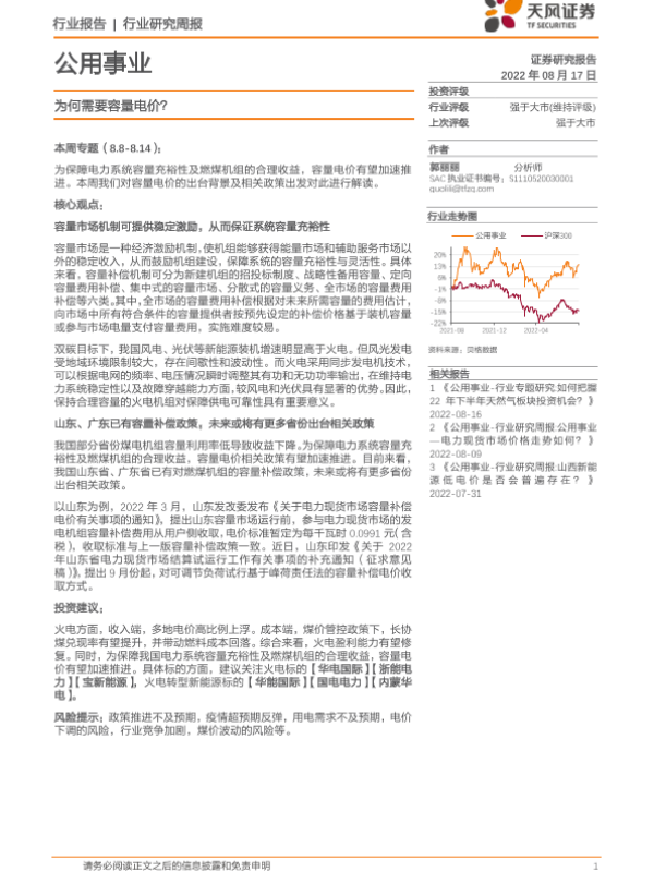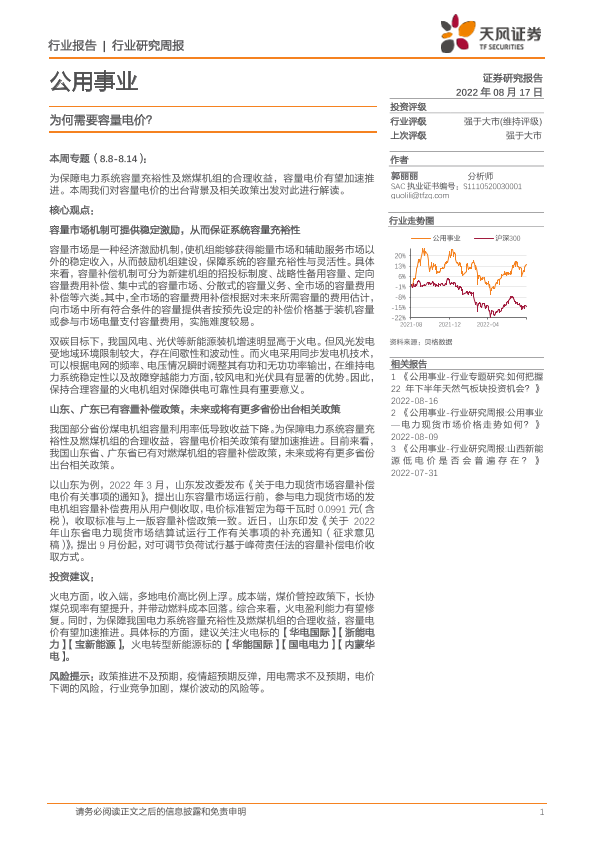 【天风证券】【20220817】公用事业行业研究周报:为何需要容量电价?-17页