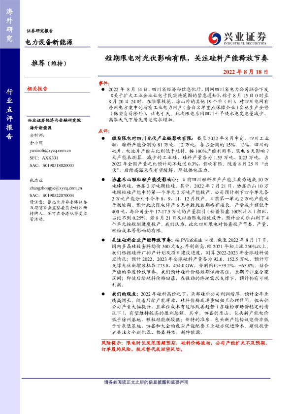 【兴业证券】【20220818】短期限电对光伏影响有限,关注硅料产能释放节奏-6页
