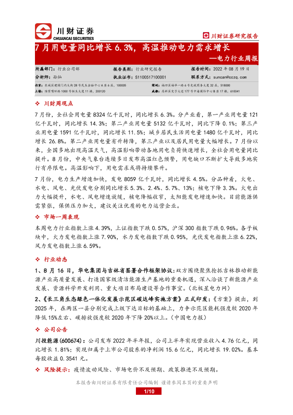 【川财证券】【20220819】7月用电量同比增长6.3%,高温推动电力需求增长-10页