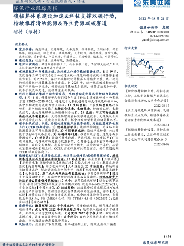 【东吴证券】【20220821】环保行业跟踪周报:碳核算体系建设加速&科技支撑双碳行动-34页