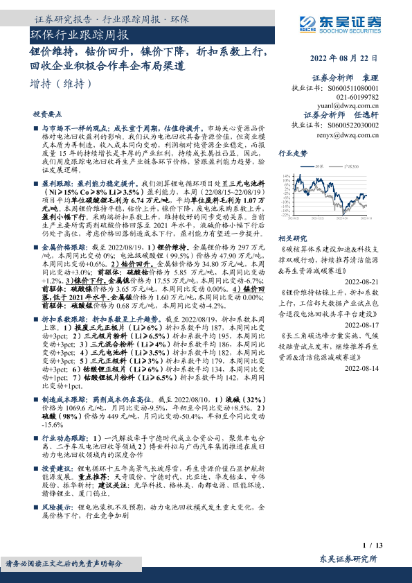 【东吴证券】【20220822】环保行业跟踪周报:锂价维持,钴价回升,镍价下降,折扣系数上行,回收企业积极合作车企布局渠道-13页
